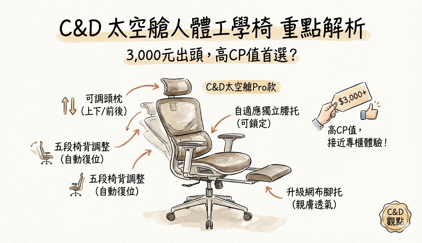 今天帶你完整解析 C&D 太空艙人體工學椅, 從頭枕、腰托、椅背段位到腳托升級, 了解它與百貨專櫃款的差異。