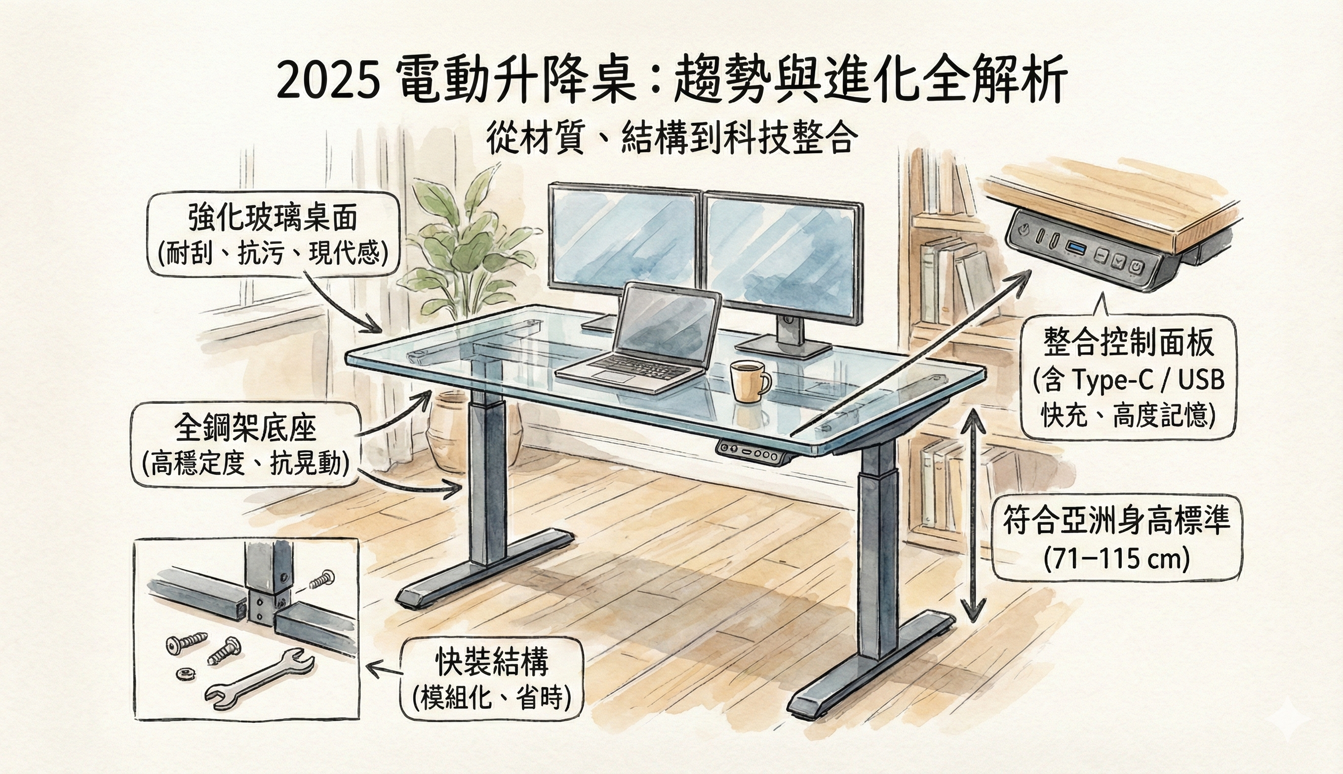 | 項目 | 過去 3–5 年的典型升降桌 | 2024–2025 新趨勢升降桌 |