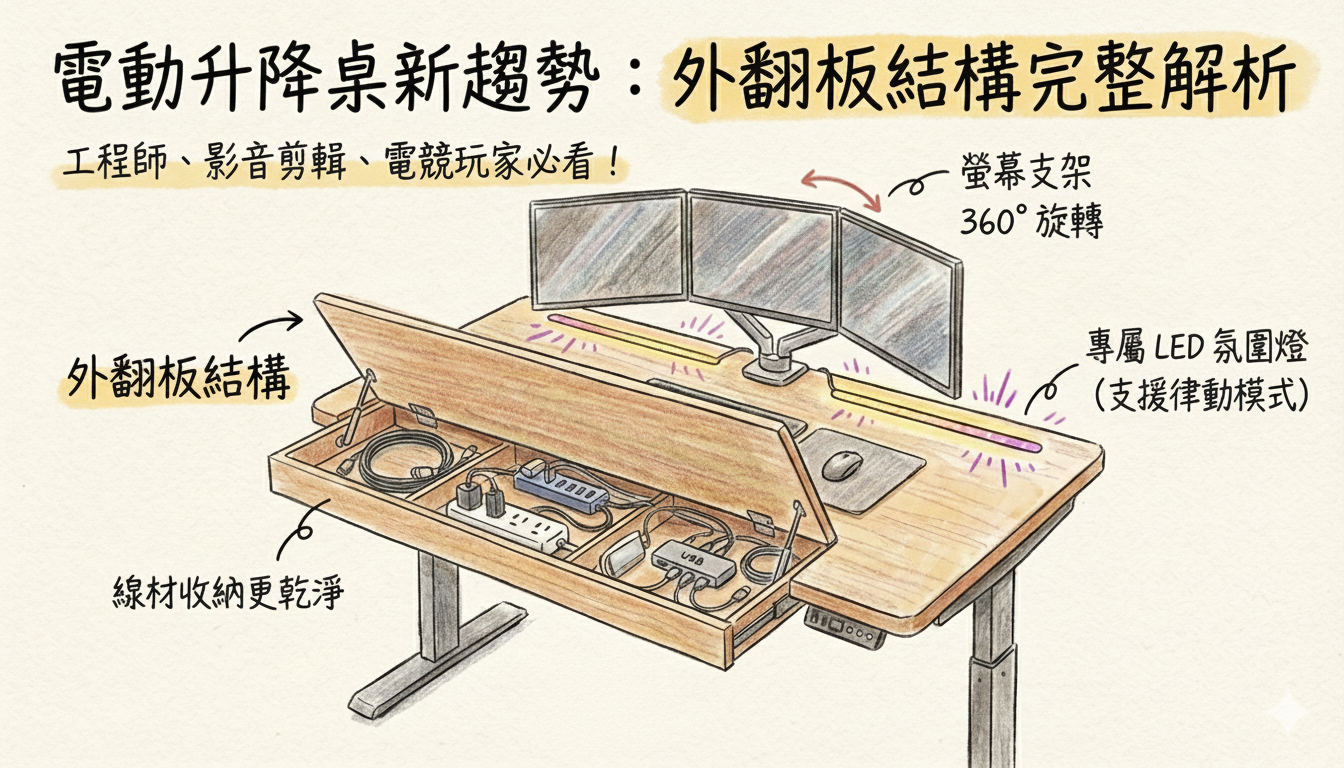 在選購電動升降桌時,多數人最在意的通常是馬達、承重、升降穩定度,但其實 「桌板結構」 才是影響每日使用體驗的關鍵。特別是近年越來越多重度使用者(工程師、影音剪輯玩家、直播主、電競玩家)開始重視線材管理與螢幕支架的兼容性,「外翻板結構」也因此成為升降桌的新趨勢。