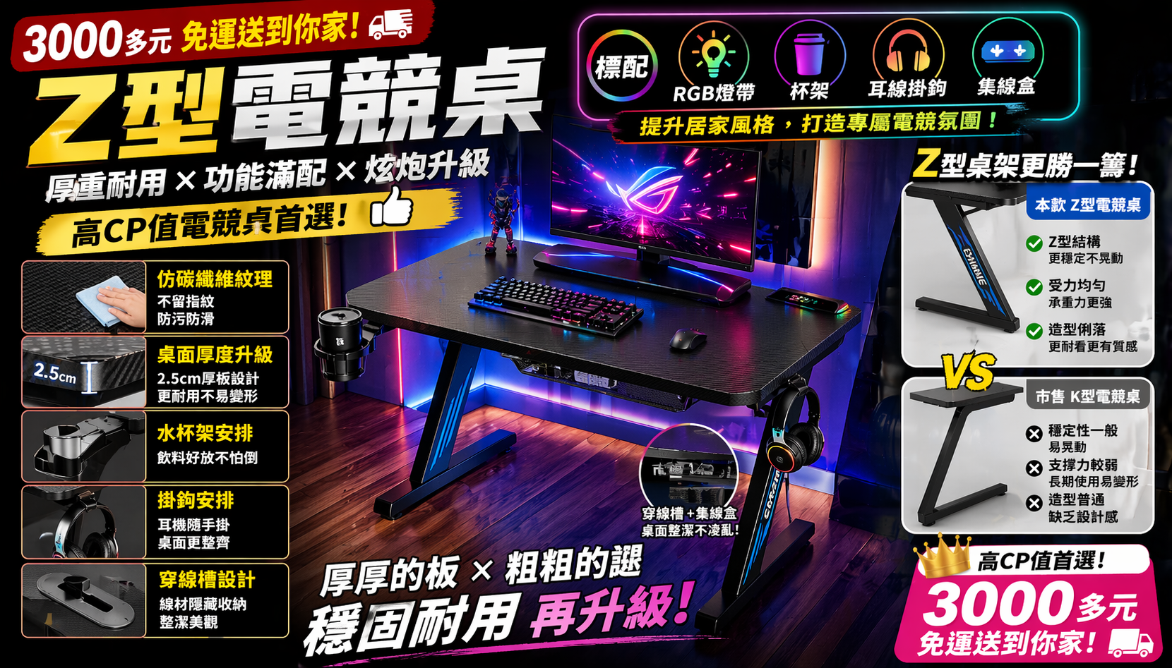 今天帶你看一款 3000多元免運送到家 的Z型電競桌, 直接解析它到底值不值得買。