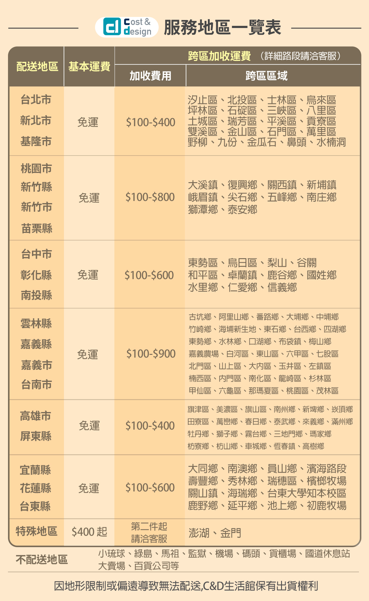 4.偏遠及部分、離島地區運費另計,下單前請先詢問,如物流判定需加收費用,會與您取得同意後再出貨
