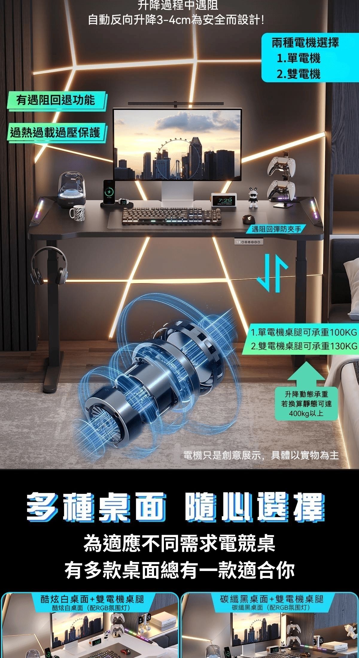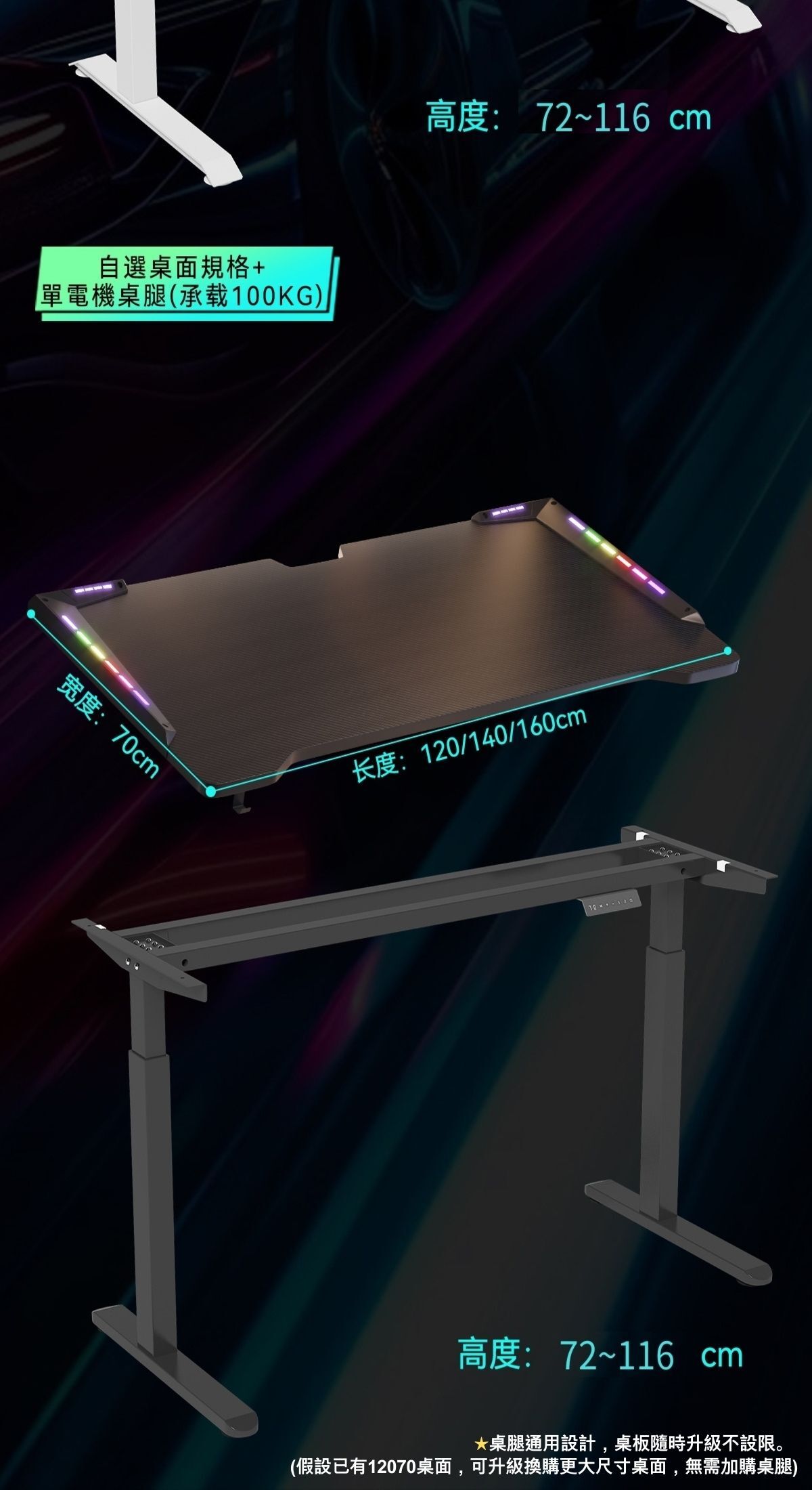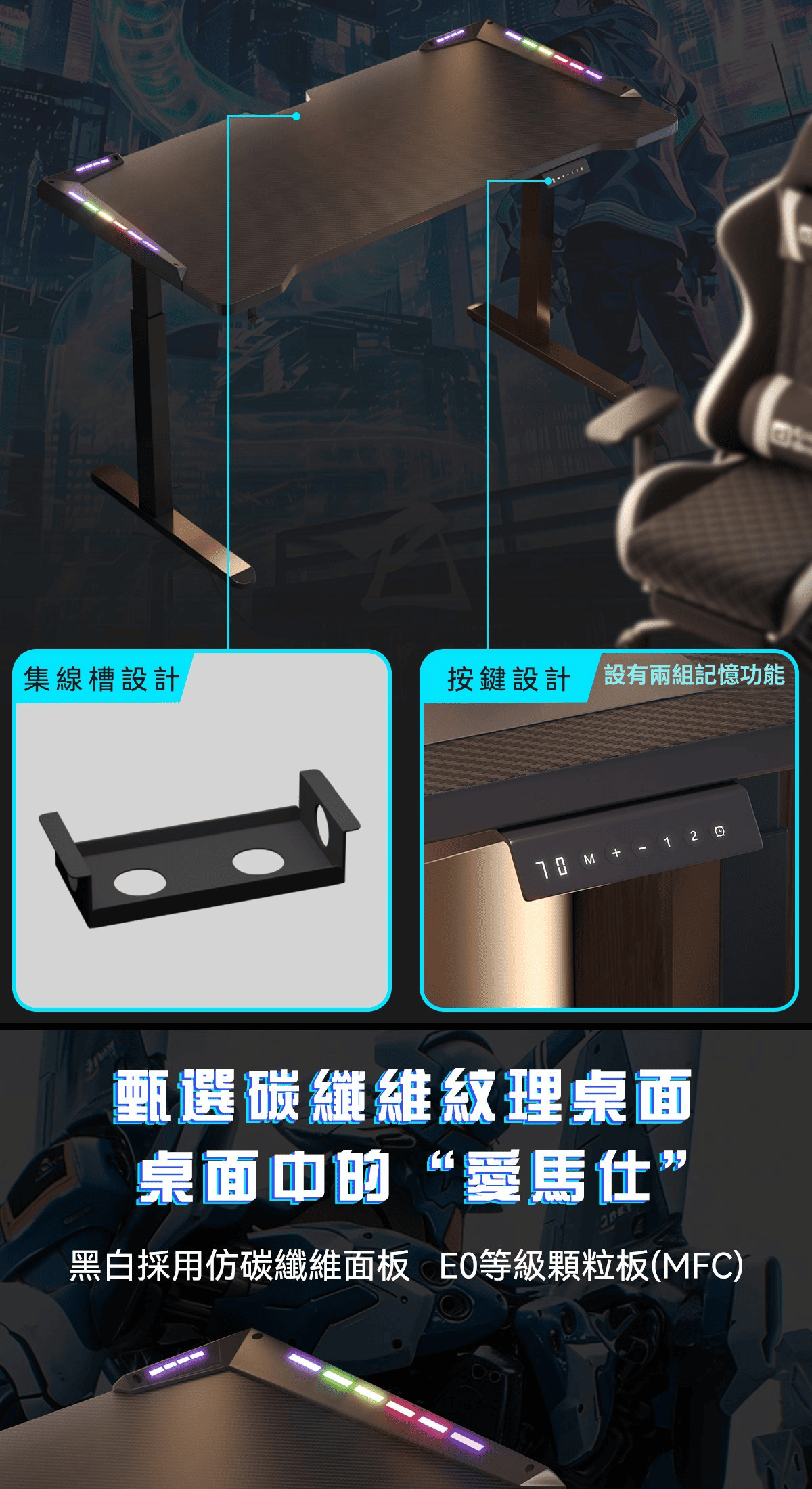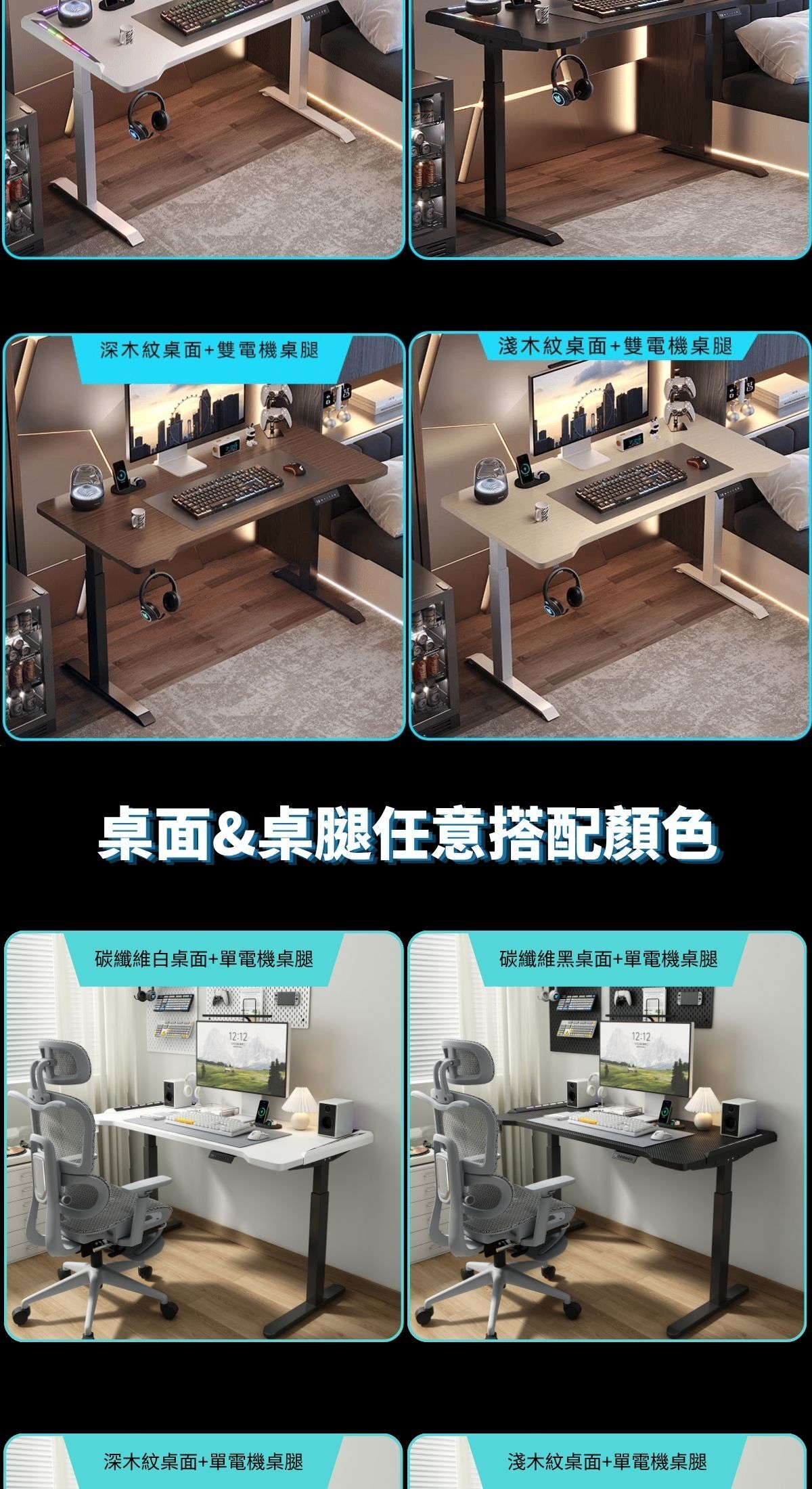 電動升降桌 單雙電機升降設計 碳纖維桌面兩色可選(升級附贈RGB氛圍燈) 木紋桌面兩色可選(無附贈RGB鎧甲燈)