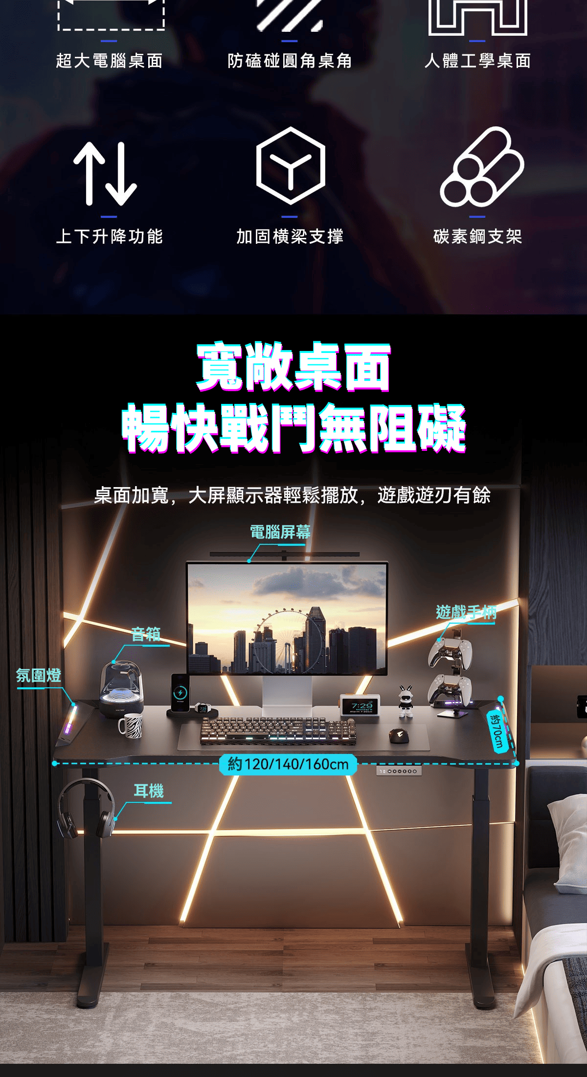 ➤碳纖維桌面加寬70CM,升級贈送RGB鎧甲燈(木紋款桌面無附贈RGB氛圍燈)