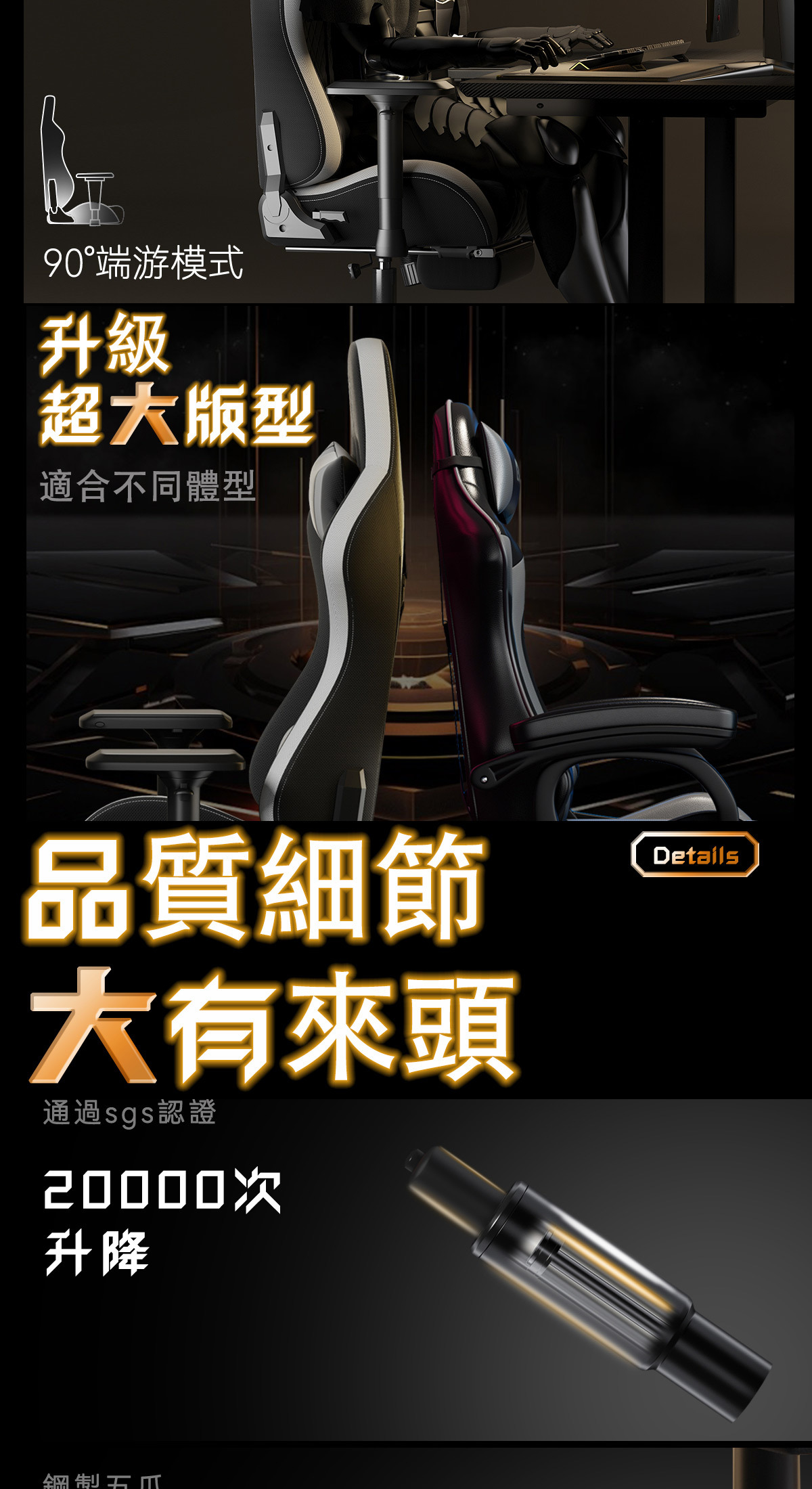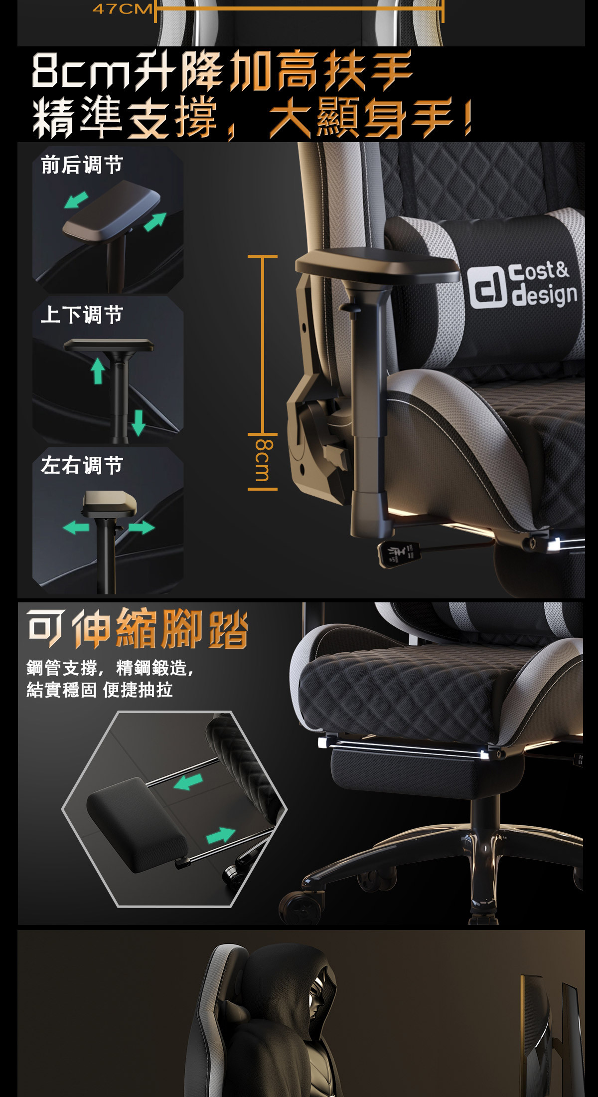※可伸縮腳踏※ 8CM升降加高扶手※90度端游模式※菠蘿透氣布料※貓抓皮抗汙性能※後仰165度※機械扶手60000次耐久※通過SGS認證