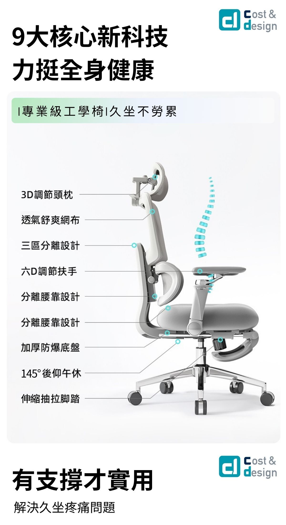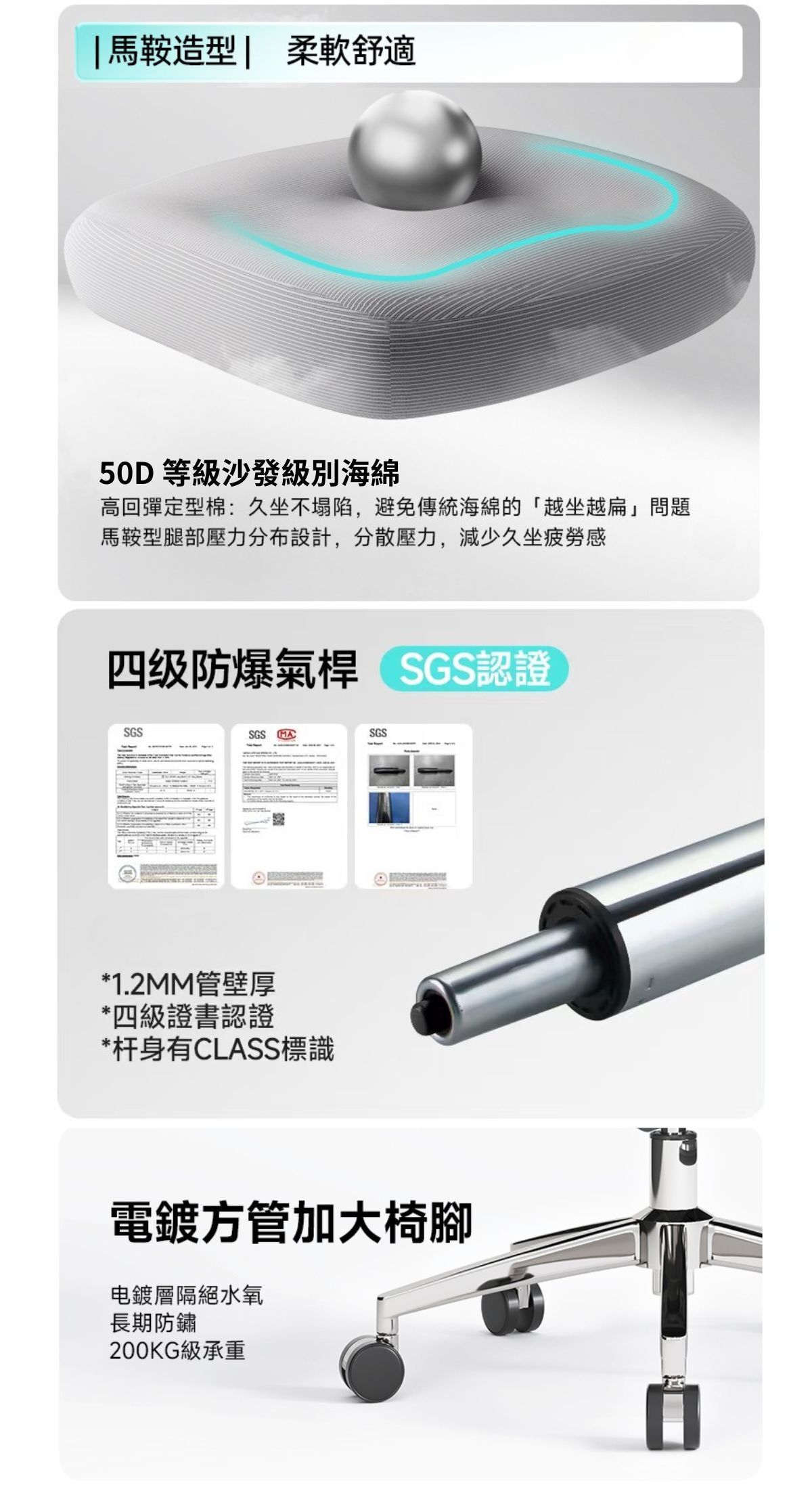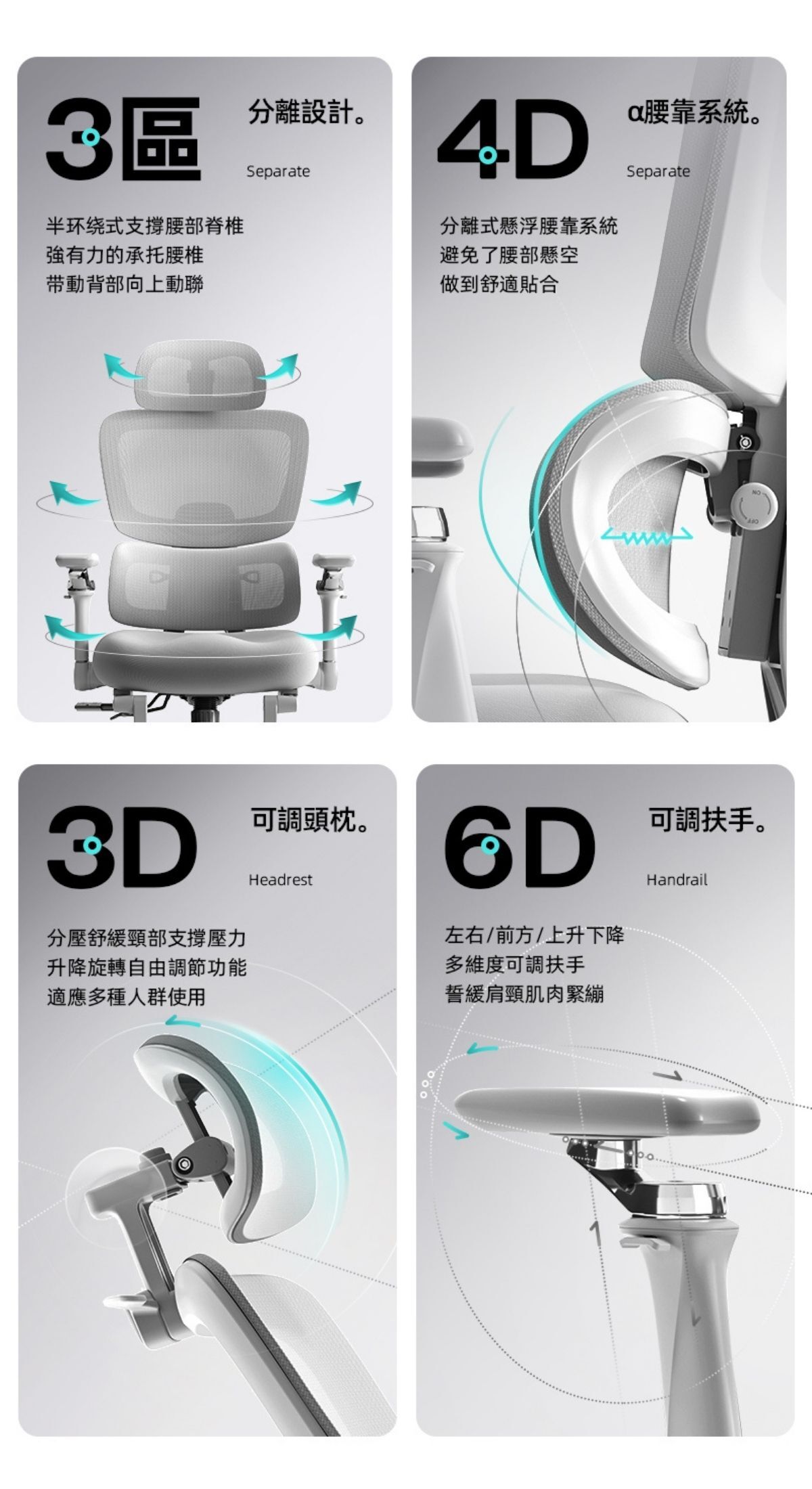 -3D調節頭枕+4D調節腰靠+6D可調扶手等部件,適應多種使用