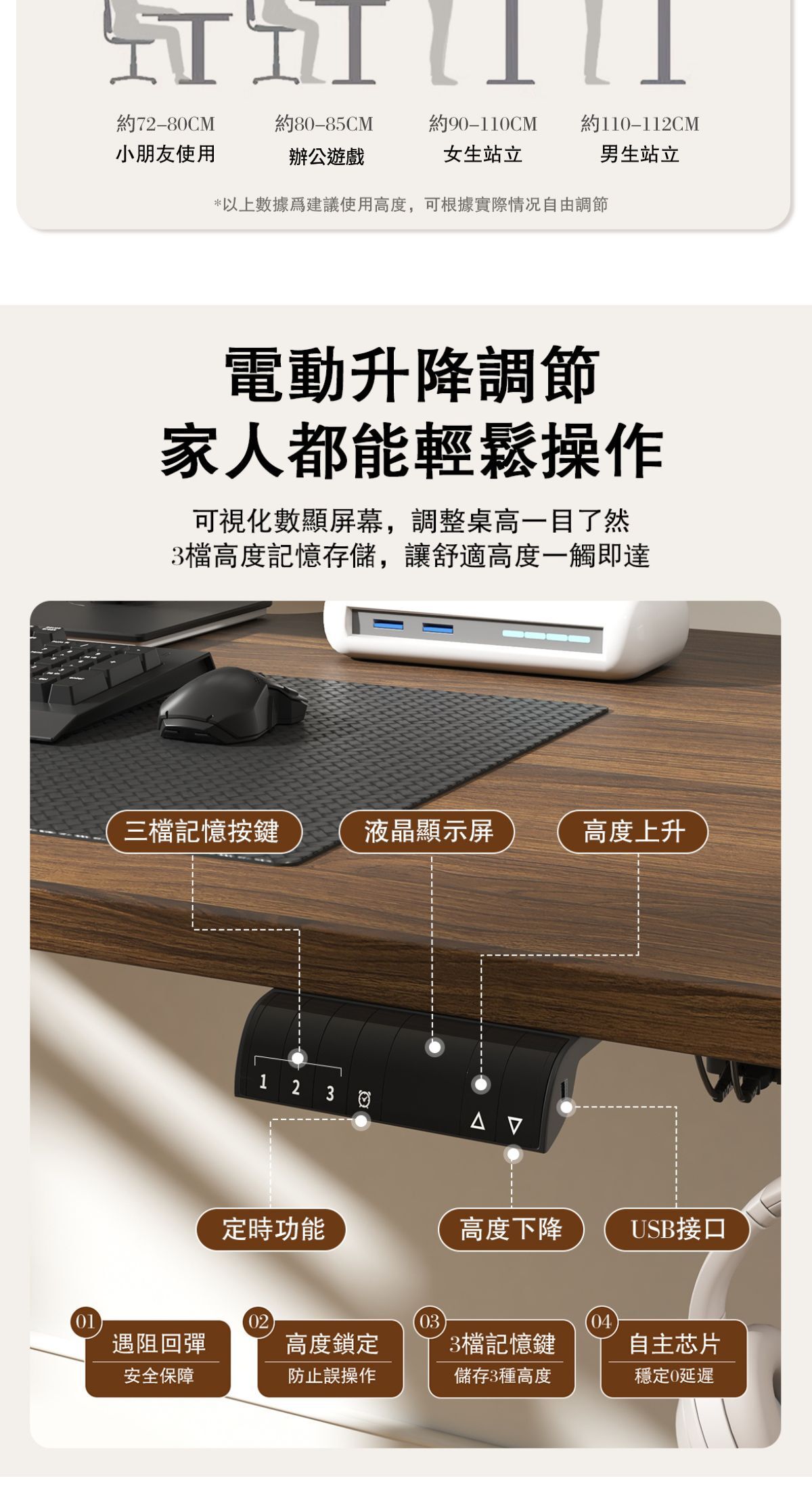 ➤桌面高度可調整,三檔記憶調節