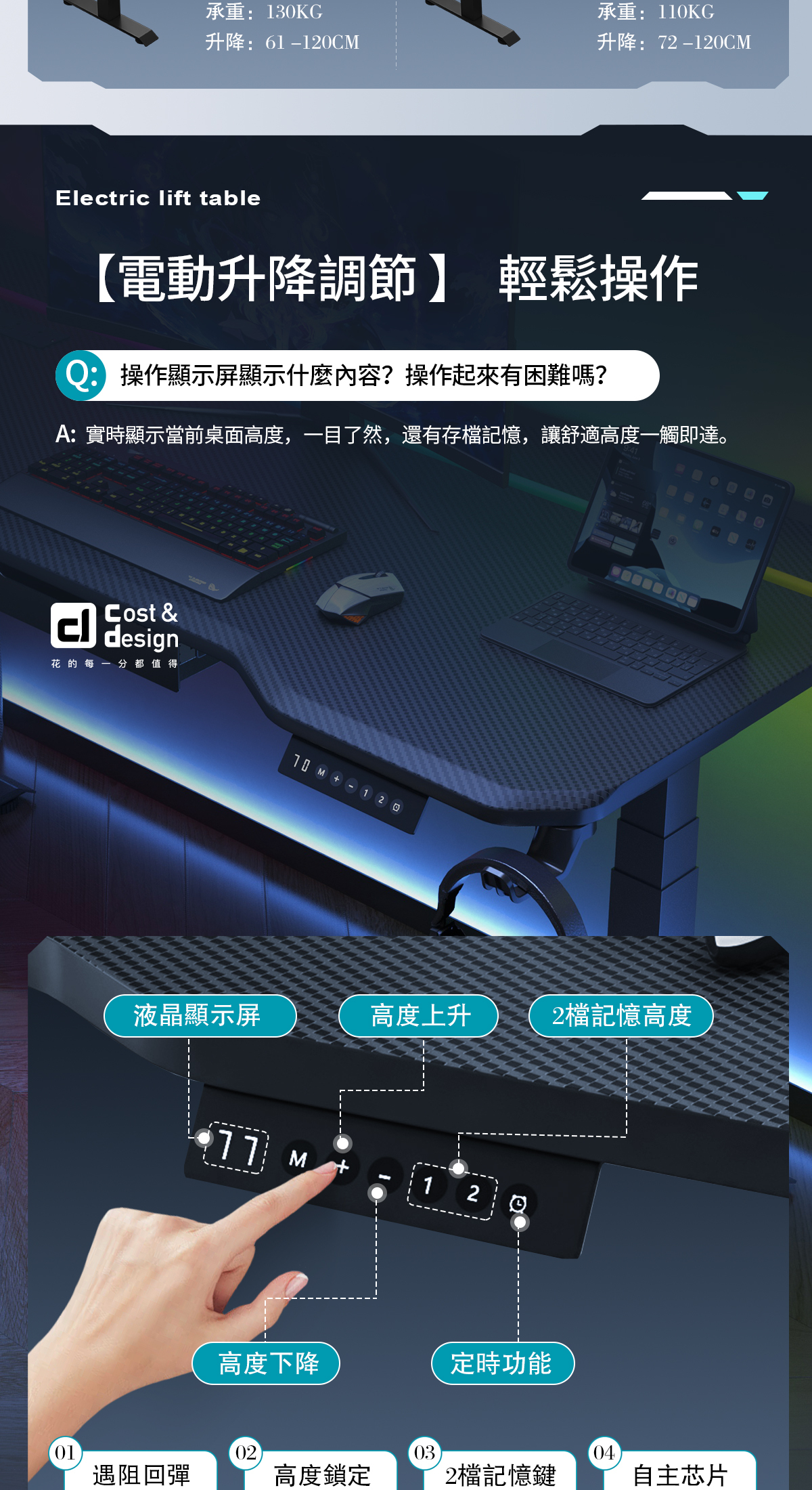 ➤桌腿雙電機,兩節式/三節式桌腿可選,遇阻回退功能+過熱保護,使用安全無虞