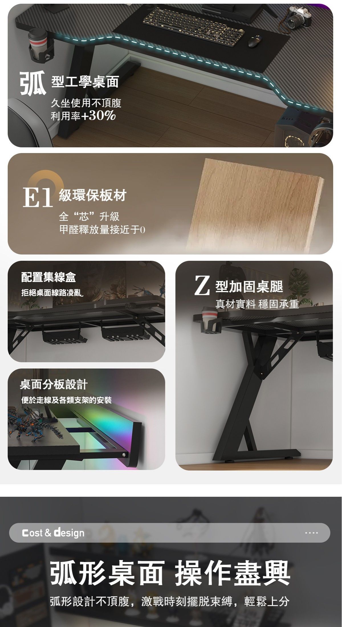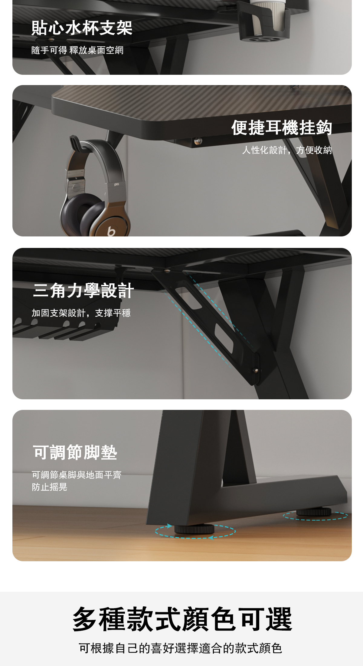 ※標配RGB燈帶+杯架+耳機掛鈎+集線盒,提升居家風格