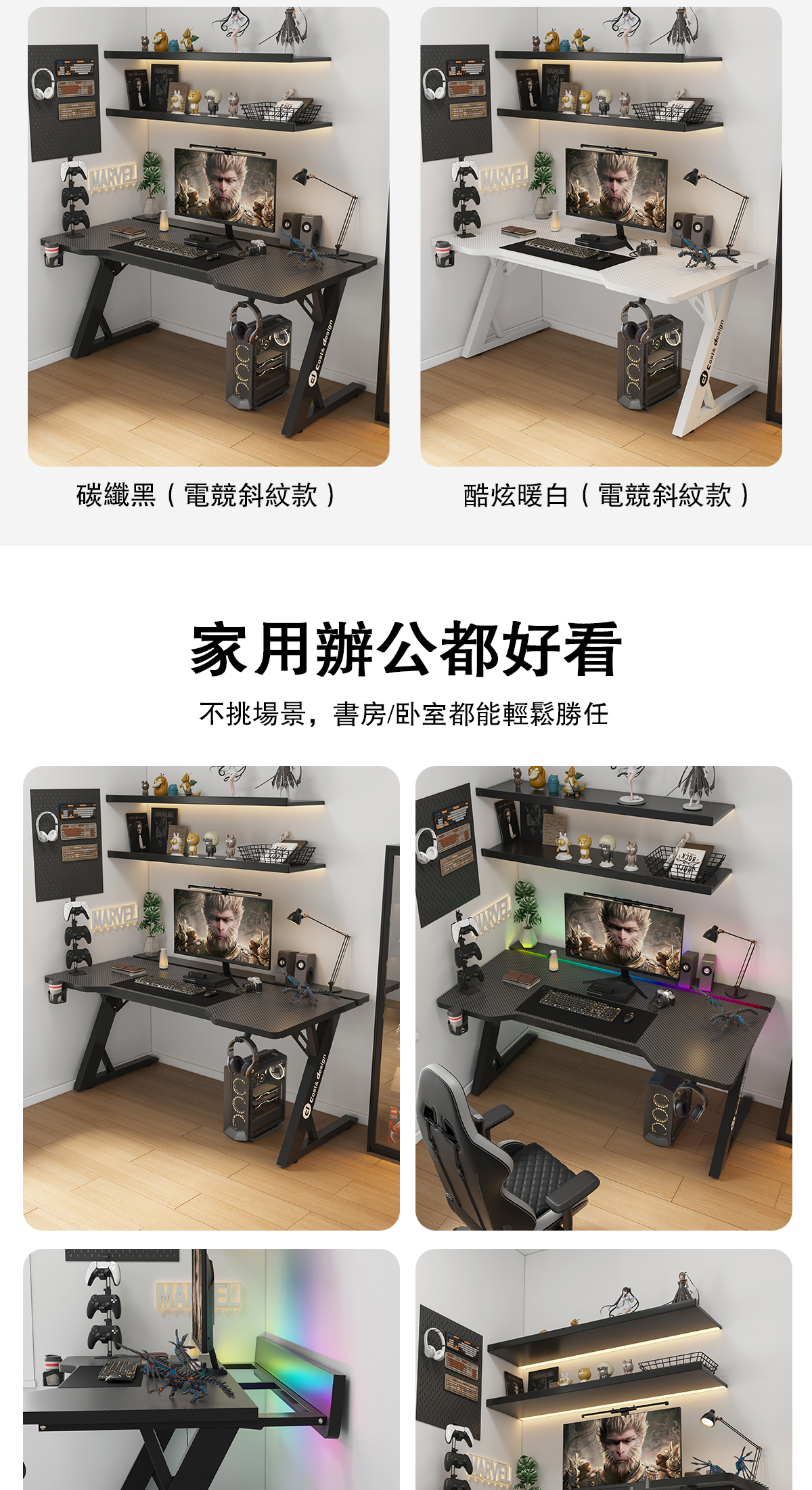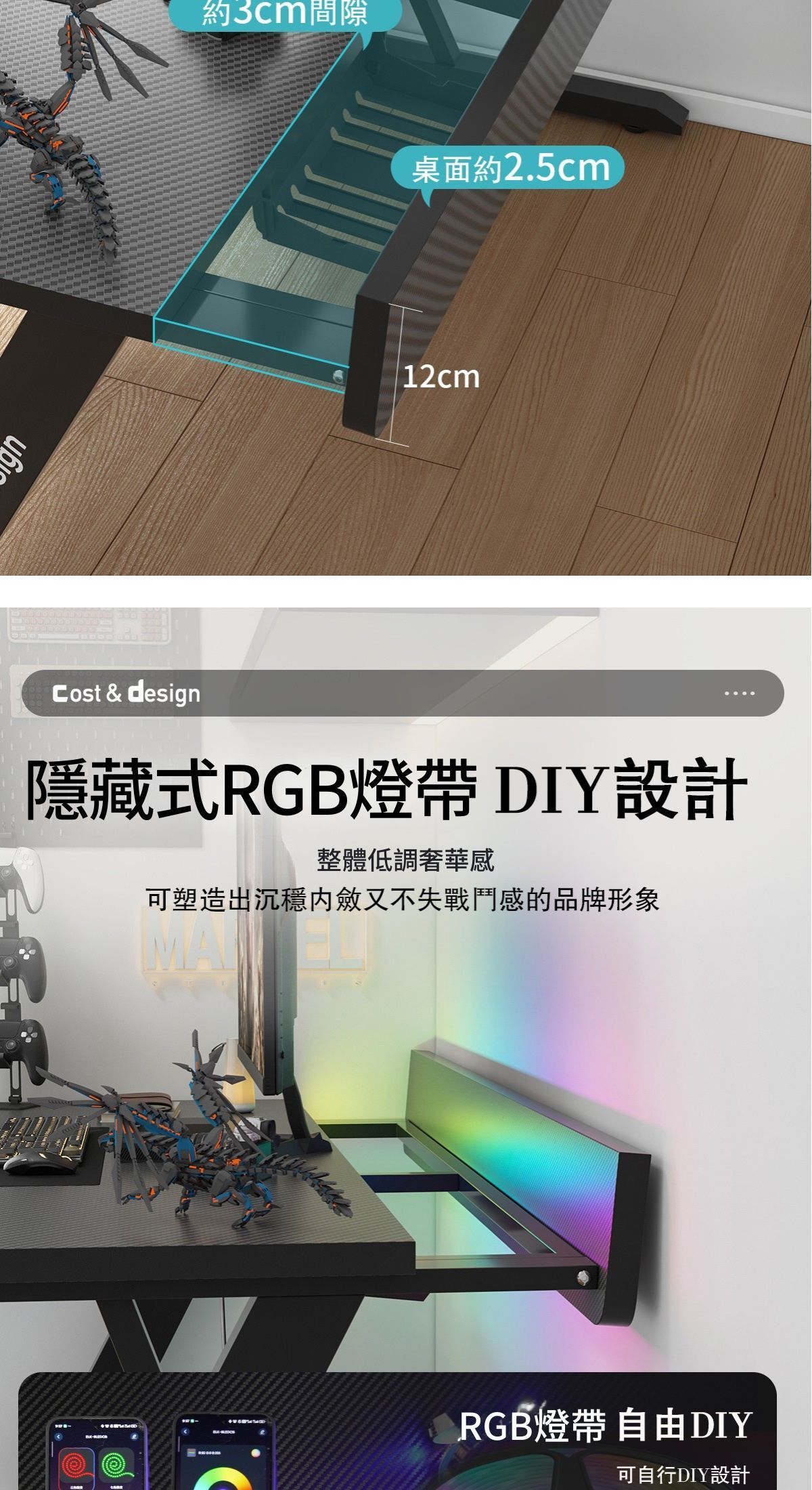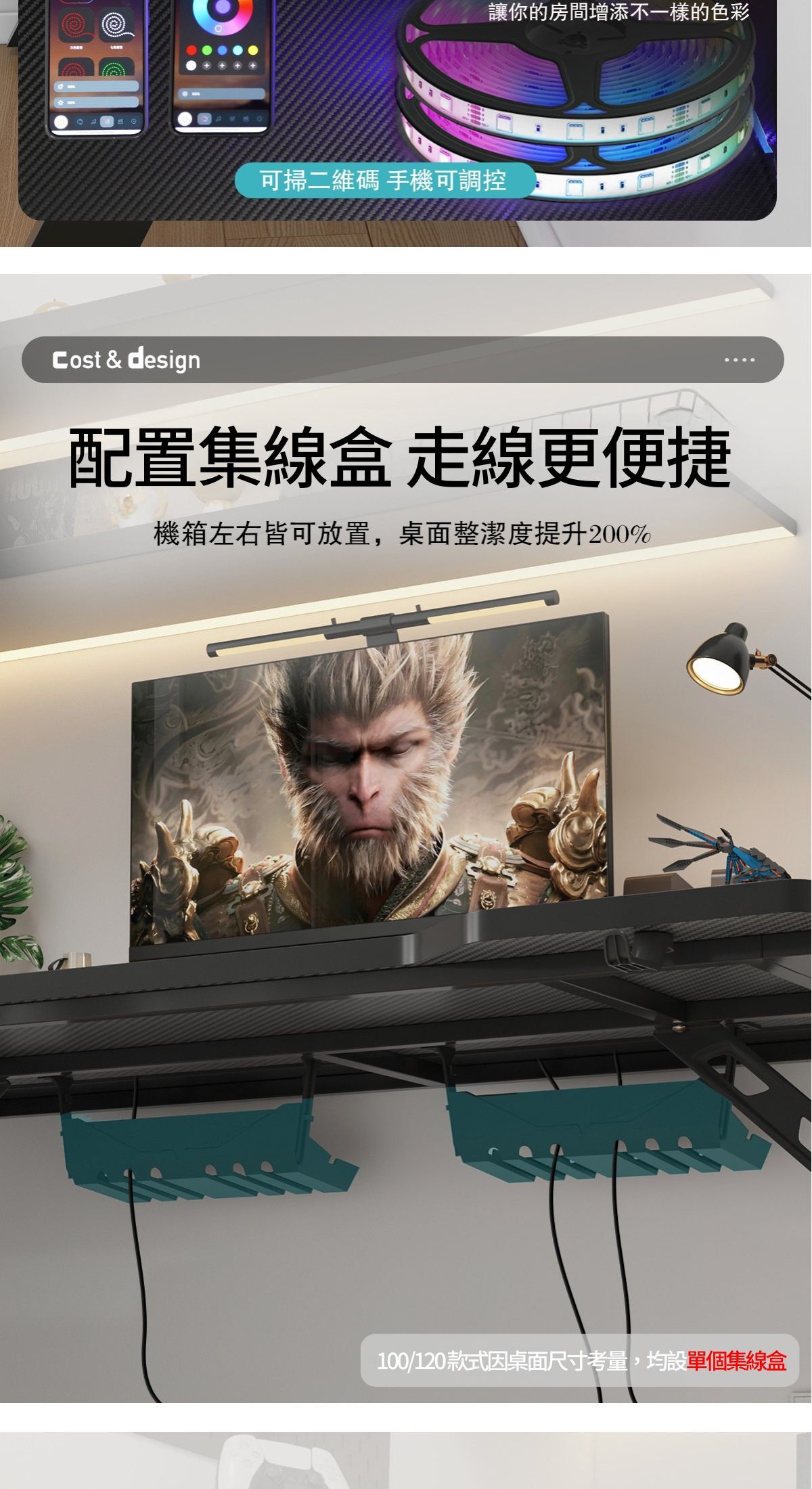【標配RGB燈帶+杯架+耳機掛鈎+集線盒,提升居家風格】